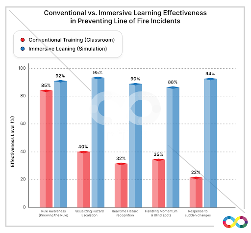 - 40-60% Faster Training & Onboarding :- Workers understand complex Line of Fire scenarios quicker thorough immersive, experience based learning.